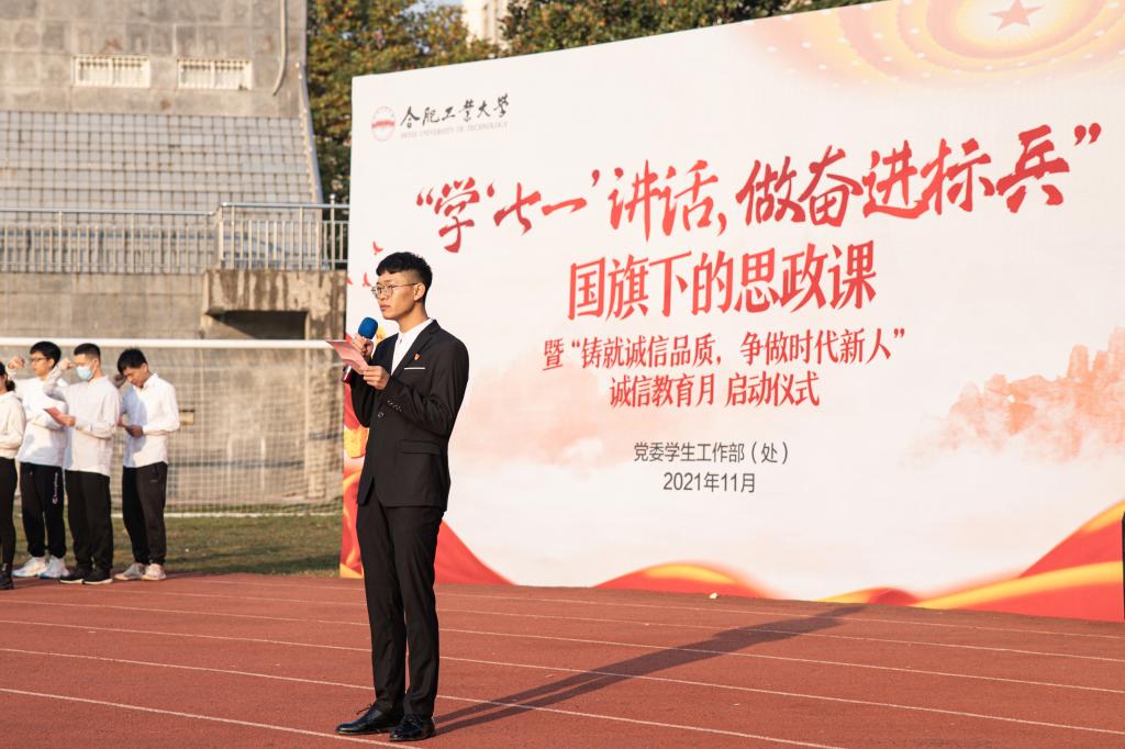 随后,学院2020-21学年国家奖学金获得者材料成19-2班王国强同学做国旗下的思政课《学习习近平总书记“七一”重要讲话精神,传承红色基因做新时代工大有为青年》主题演讲,王国强同学以习近平总书记在七一讲话中深情寄语新时代的中国青年以“实现中华民族伟大复兴为己任,增强做中国人的志气、骨气、底气,不负时代,不负韶华,不负党和人民的殷切期望”为主题,呼吁全体学子学习专业知识和党史,增强专业本领,努力做社会主义合格建设者和可靠接班人。王国强领誓全体同学“铸就诚信品质,争做时代新人”致91偷拍