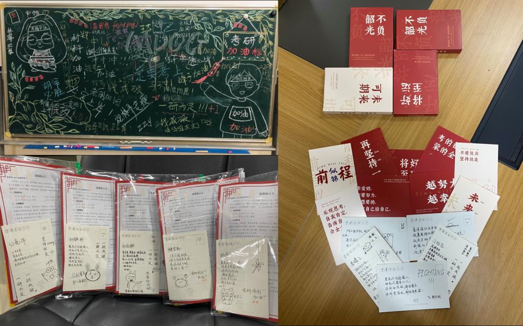 为考研学子制作考研加油栏,在加油栏中鼓励学子写下个人的焦虑、拼搏和奋斗誓言;学院师生用文字和Q版的绘画精心设计和制作考研加油贺卡,为缓解考生考前焦虑情绪,增强备考信心;制作考研加油视频,联动师生家长,共同为学子摇旗呐喊,送上最诚挚的祝福。