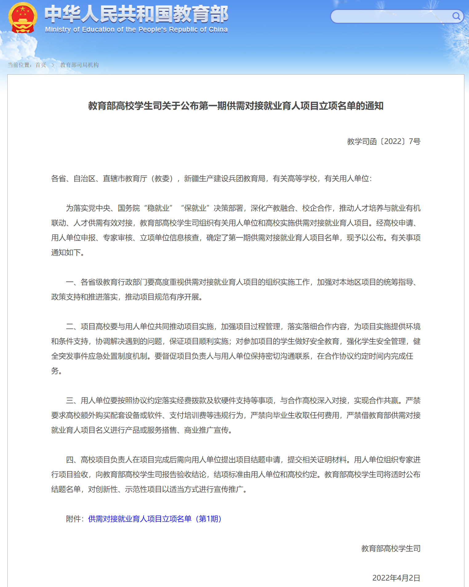 近日,教育部发布《教育部高校学生司关于公布第一期供需对接就业育人项目立项名单的通知》(教学司函〔2022〕7号),91偷拍