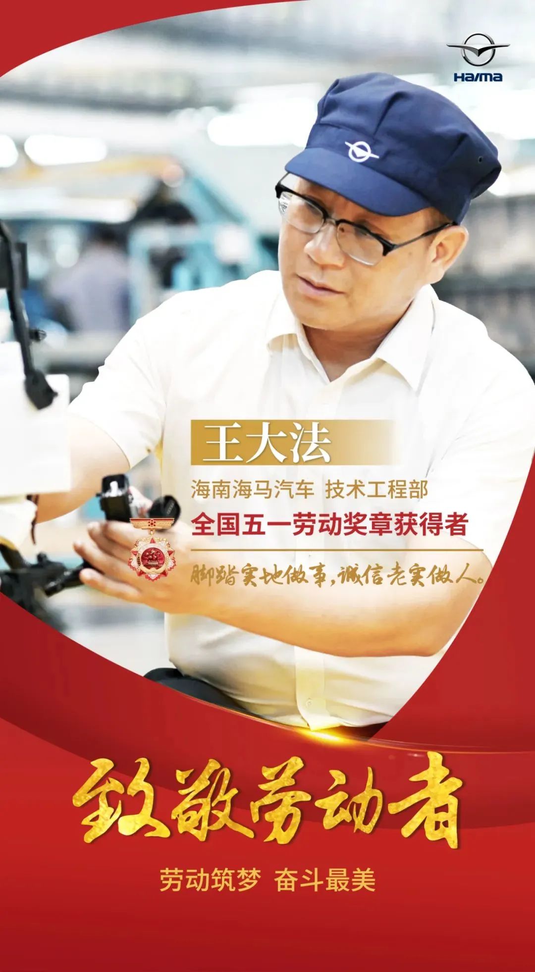 1992级焊接专业校友,1996年加入海马,先后担任总装部部长、焊装部部长、生产管理部部长、海外技术部部长等职务。作为海南海马汽车KD项目负责人和有着16年党龄的老党员,王大法长期带领团队驻扎中东,克服语言和文化理念差异的困难,积极合作沟通,借助“一带一路”的国家战略,采用KD散件输出、国外当地组装的技术输出方式,使海马S7、S5等车型项目先后在中东落地,为中国汽车从整车国际贸易出口到产品与技术输出的转变作出了卓越贡献,也促进了海南省汽车工业的发展。