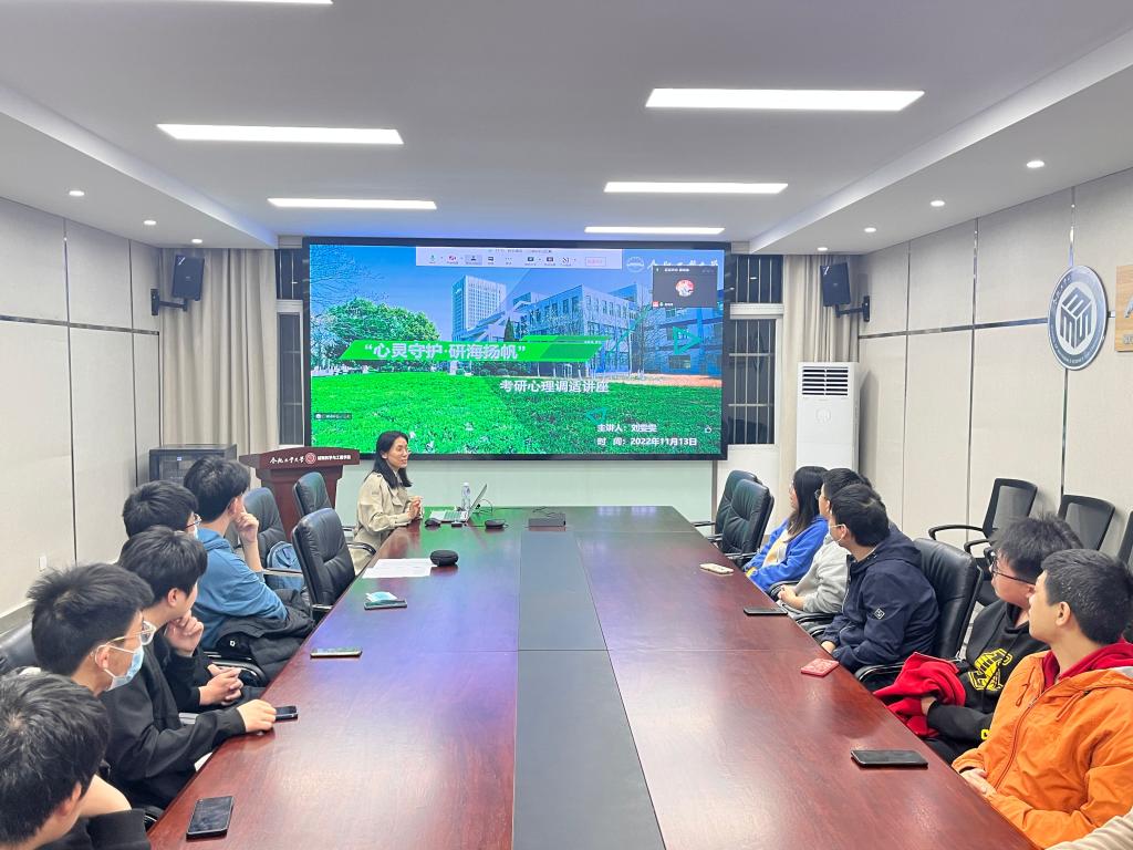 举办了“心灵守护 研海扬帆”考研心理调适讲座,邀请校心理健康与发展咨询中心刘雯雯老师主讲,2019级部分考研学生通过线上线下方式聆听讲座。