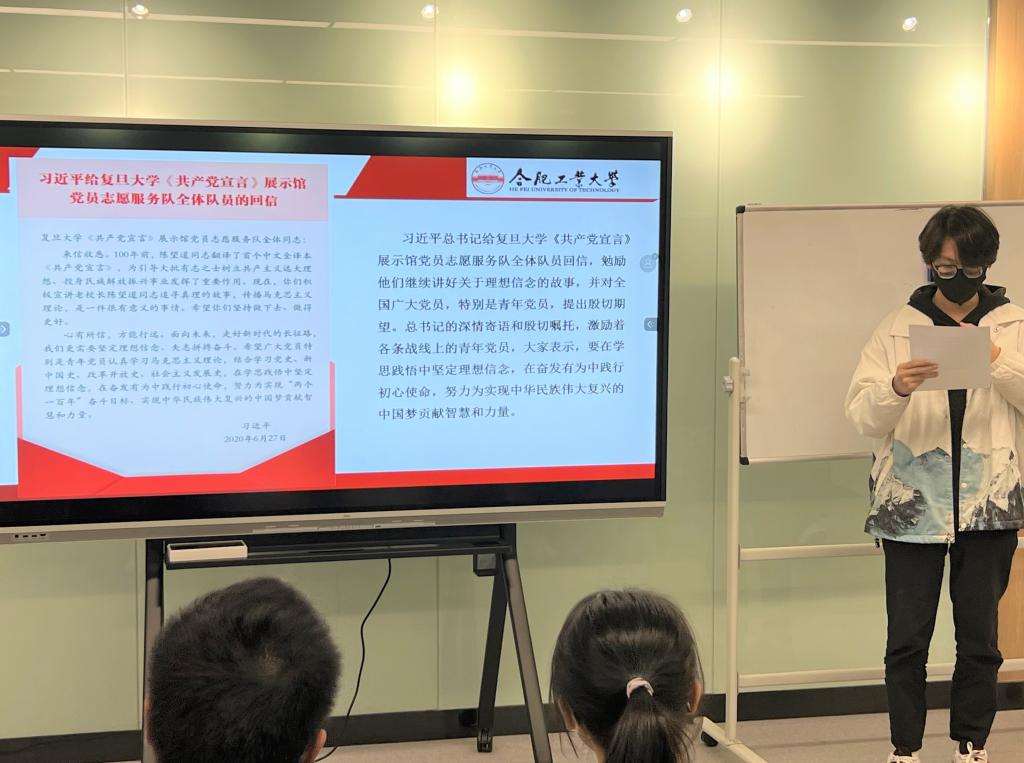 分享会上,同学们通过诵读书信原文,配合真实图像、影视资料等,学习了七篇习近平总书记写给青年大学生的回信以及回信背后的故事,从回信北大援鄂医疗队到给复旦大学《共产党宣言》展示馆党员志愿服务队全体队员,其中无不体会习近平总书记对于青年大学生的殷切关怀,在纸短情长的书信间,青年学子进一步明确前进方向、端正入党动机。