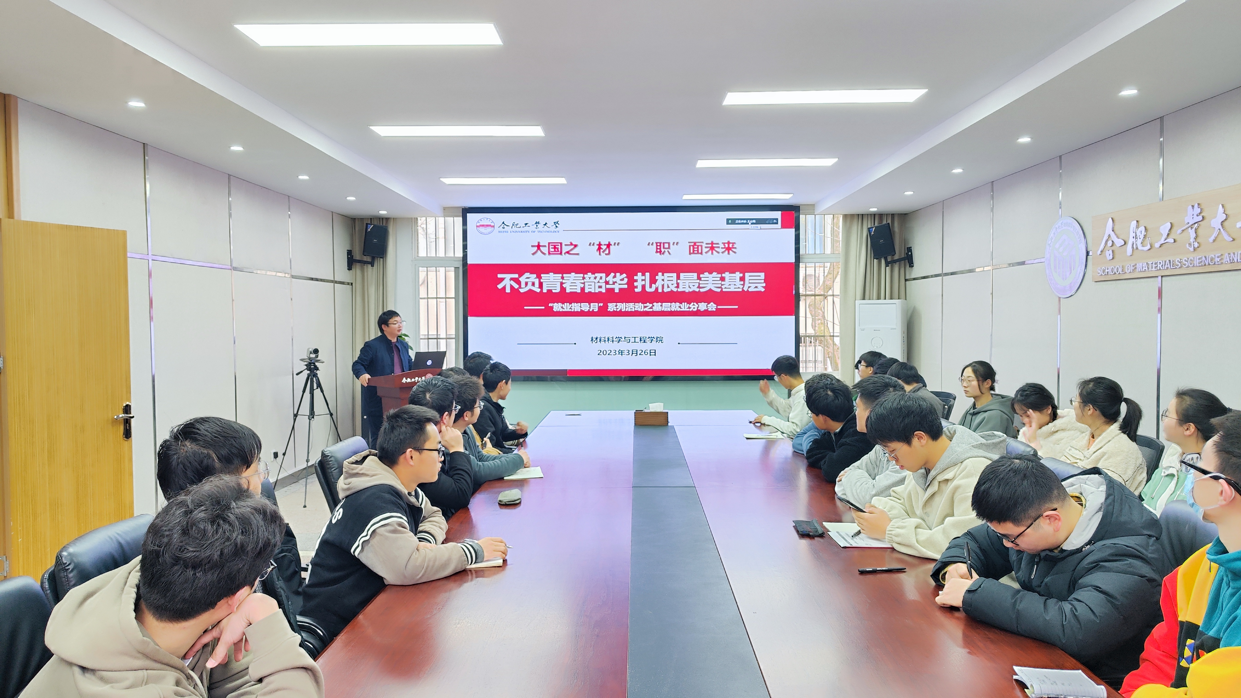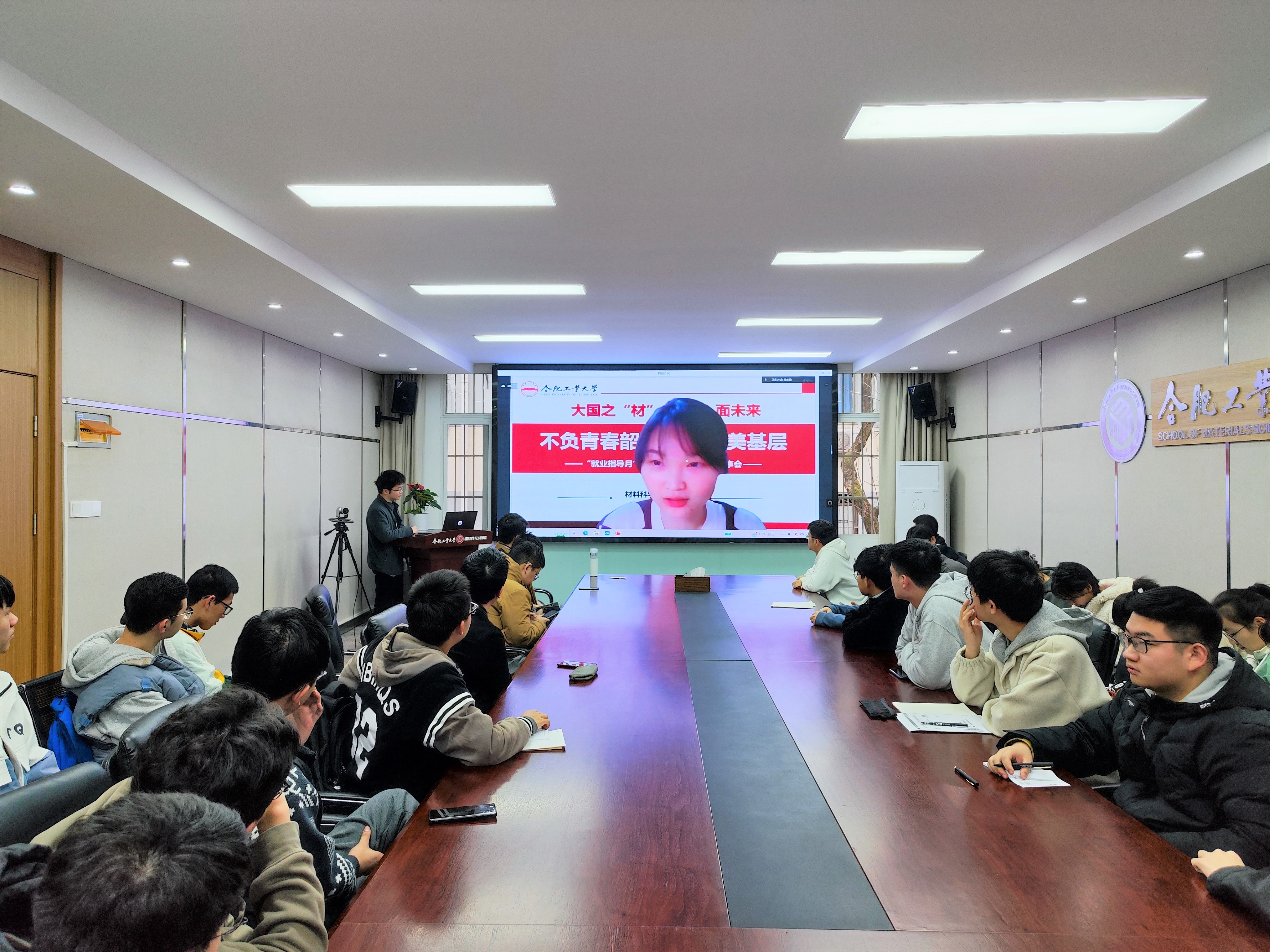 在屯溪路校区材料楼综合服务中心210举办“大国之‘材’,‘职’面未来”就业指导月系列活动之基层就业分享会。学院2020级全体学生党员40余人参加本次分享会。