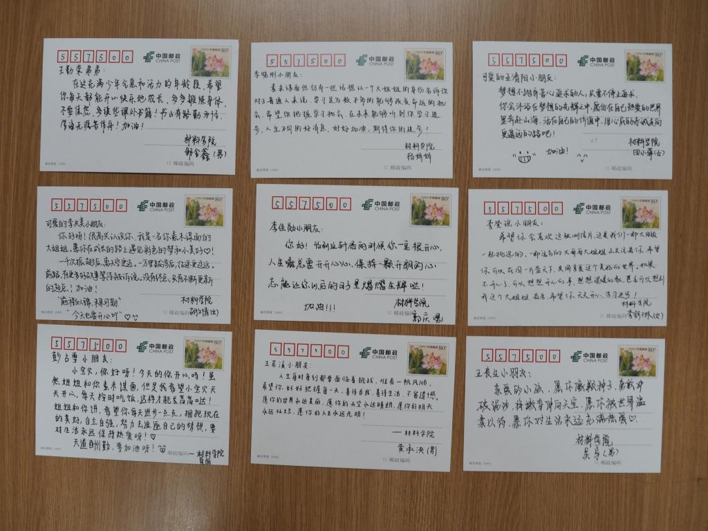 4月13日,学院研究生会成员和材物化研究生党支部的党员们齐聚91偷拍 小红楼103,为长青第二小学五年级(2)班的27名小学生精心挑选91偷拍 主题的明信片,并认真书写了对孩子们想说的话,为孩子们送去美好的祝福。有的同学们讲述了最近学习生活中的趣事,有的同学描绘了工大校园的美丽景色,有的同学分享了大学生活的美好……在明信片的最后,大家不约而同地写下了对丹寨孩子们的鼓励与祝福,希望他们能够健康快乐地成长。此外,学院还为山区小朋友们准备了学习工具大礼包,在精神上给予鼓励的同时,也为小朋友们送上最需要的物资,帮助他们更好的求学与成长!