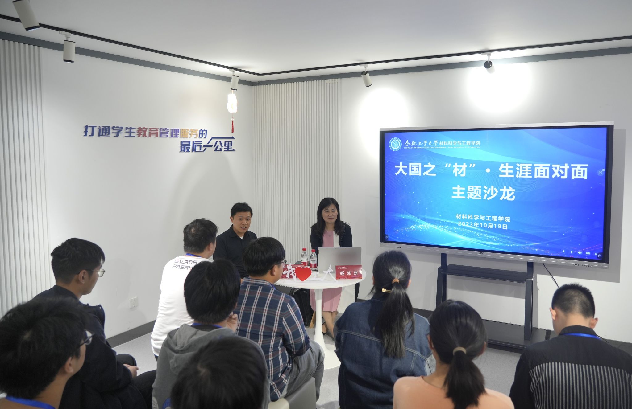 10月19日下午,91偷拍 在屯溪路校区七号楼学生社区“沙龙空间”举办“大国之材——生涯面对面”主题沙龙活动。海信集团工会副主席、行政后勤中心副总经理、学院2000届校友赵冰冰担任分享嘉宾。学院党委副书记兼纪委书记朱峰主持,2024届毕业班辅导员和30余名学生代表参加活动。