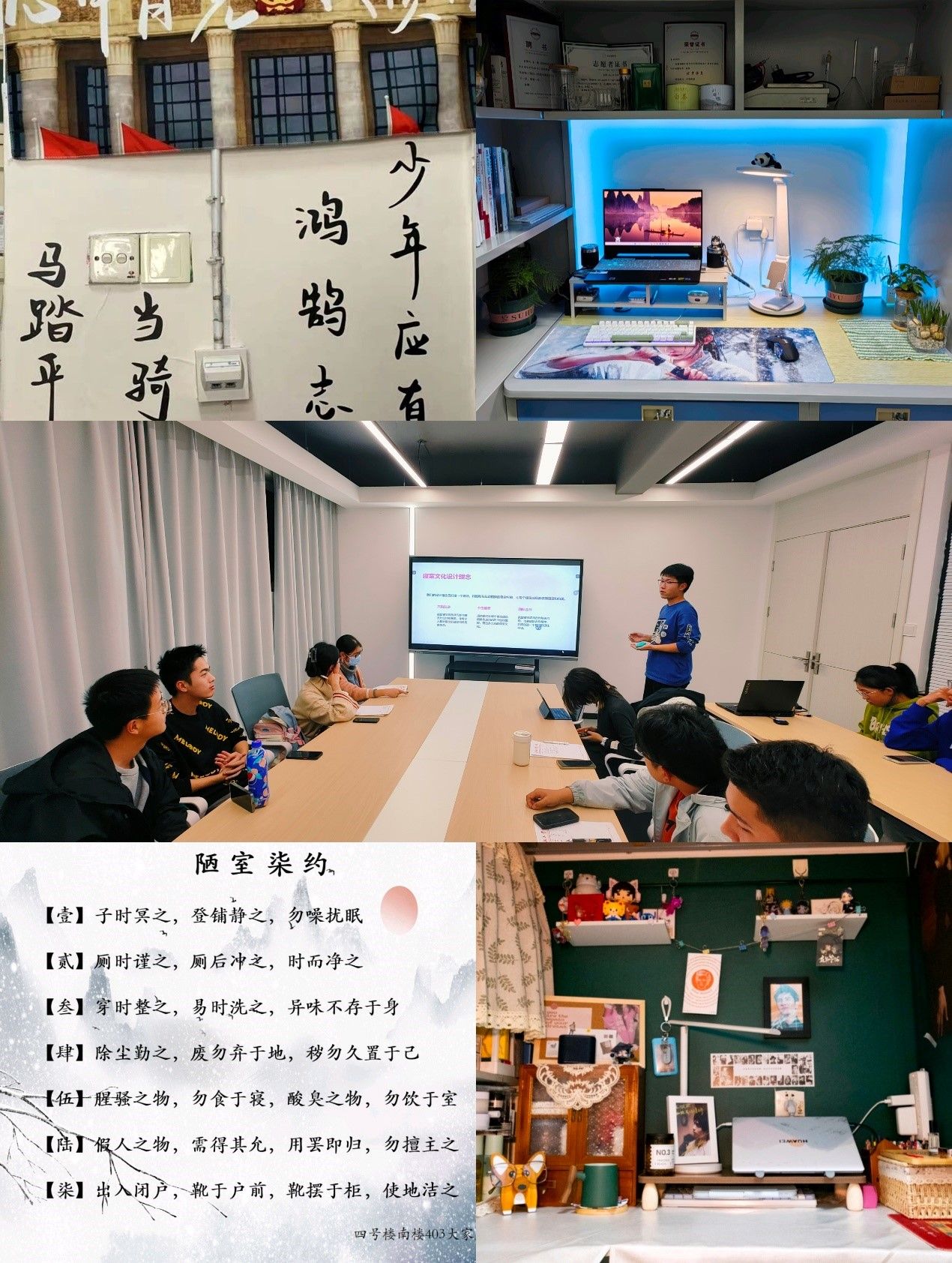 同学们积极布置装饰寝室、书桌,制定落实寝室公约,不仅展现出了学生们创新能力与综合素养,也让寝室同学的感情一路升温。优秀作品中,有“最美寝室”在墙上张贴“少年应有鸿鹄志”字幅尽显励志,有“最美书桌”在桌上摆放绿植凸显温馨,更有“最美寝室公约”以古语写就,独具一格……