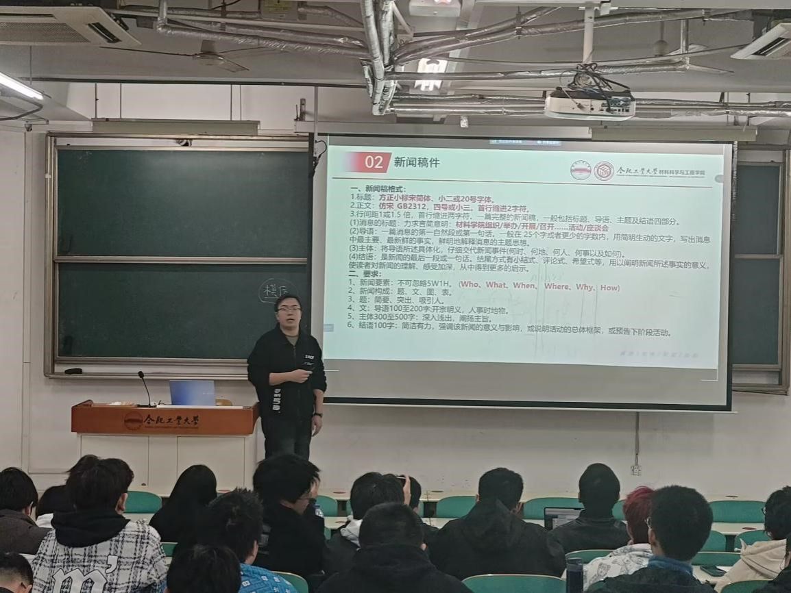 葛海涛以“如何写好一篇新闻稿件”为题,从对新闻的认识和写作新闻的准备工作、写作要求、注意事项等方面细致展开讲解,并与在场学生互动,让他们对培训内容充分理解并牢记在心。同时,他对学生骨干在新生群体中的领导、协调能力提出建议,希望班委们能够积极建成向上向善的班集体氛围。