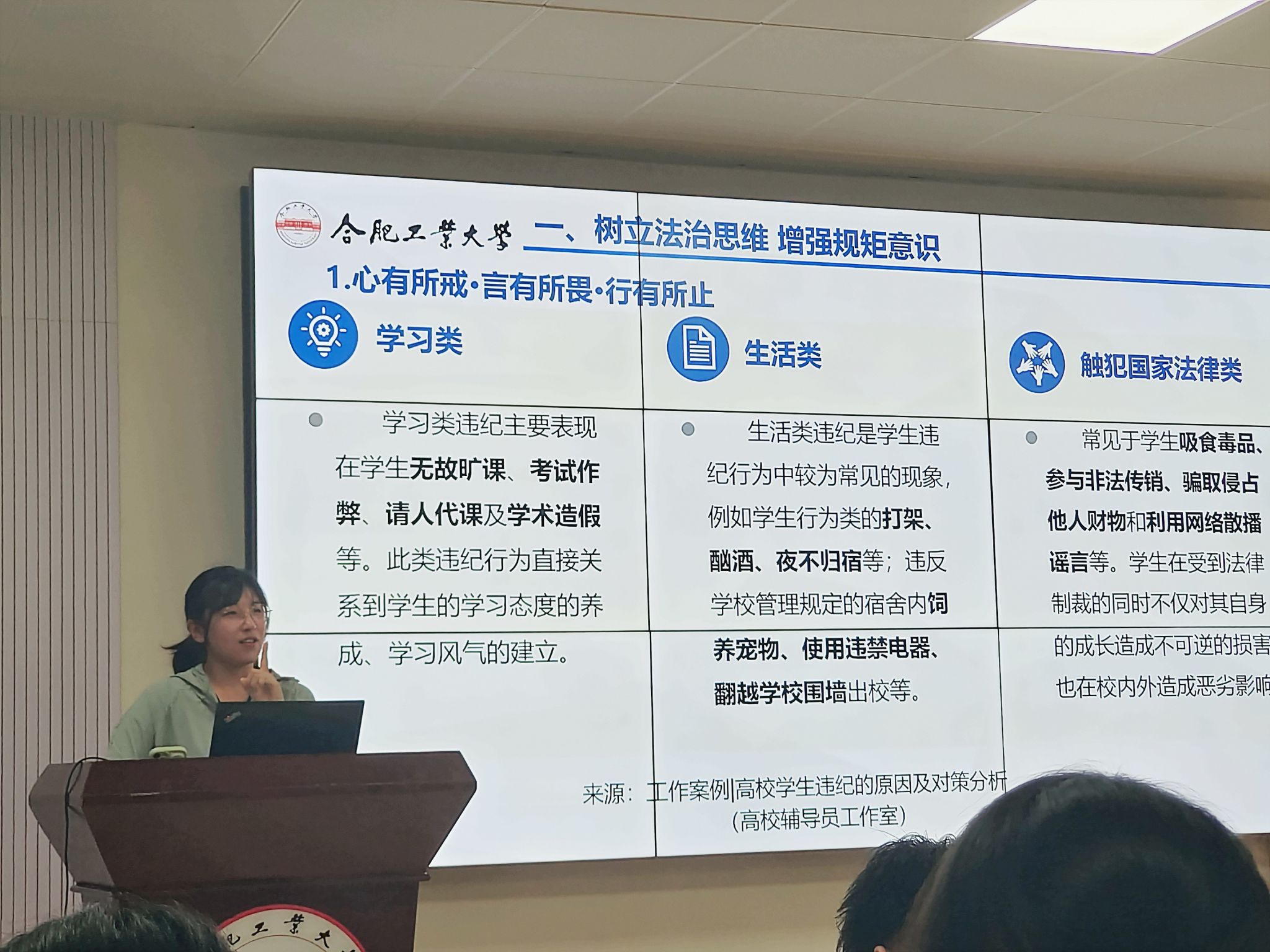 本次班会“以案说纪、以案警示、以案明理”,通过深入剖析当前大学生违规违纪违法的典型案例,加强学生对相关法律法规、规章制度的学习、理解和把握,真正做到内化于心、外化于行,促进学生强化规则意识,养成良好的行为习惯。