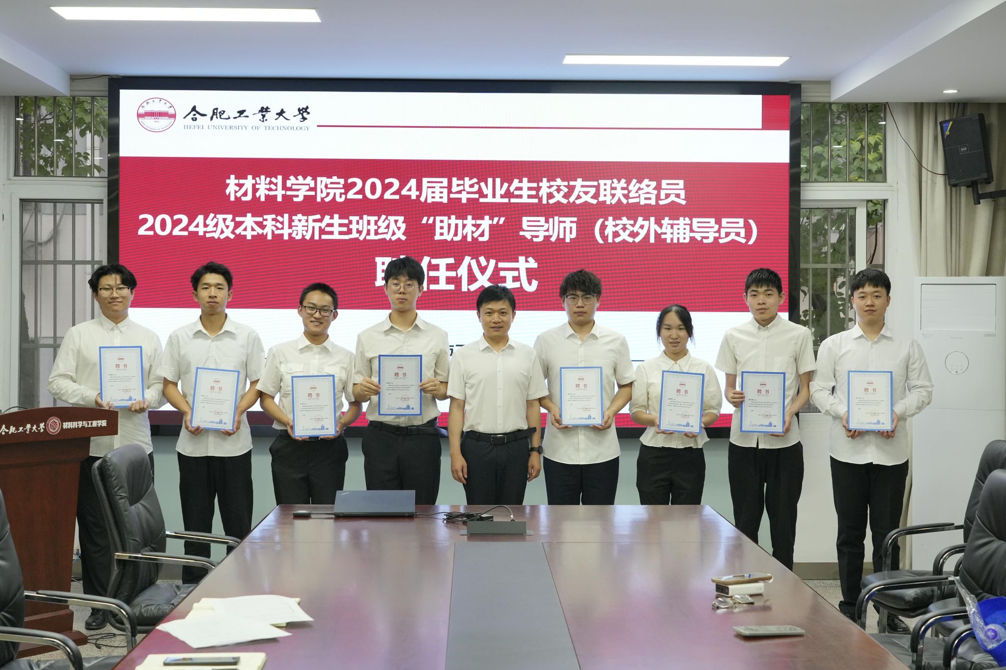2024级本科新生班级“助材”导师(校外辅导员)的决定》,学院聘任材料成型及控制工程20-2班张雅婷等8位校友担任2024级本科新生班级“助材”导师。与会领导老师为新聘校友联络员和“助材”导师颁发了聘书并合影留念。