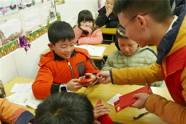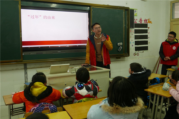 当天下午两点,志愿者一行顺利到达民生小学,组织孩子们就坐后,传统节日文化主题教育活动正式开始,志愿者以传统节日中的“春节”为切入点,通过PPT展示、视屏播放及现场互动等方式向孩子们介绍了“年”文化的由来以及春节期间各地的相关风俗习惯,志愿者在提到民间神话传说中的恶兽“夕”的时候,孩子们睁大了双眼,好奇的向志愿者不断的追问,课堂气氛显得异常活跃。课间休息时间,志愿者将精心准备的“节日文化卡片”小红包和糖果发到了孩子们的手中,孩子们的脸上露出了灿烂的笑容。