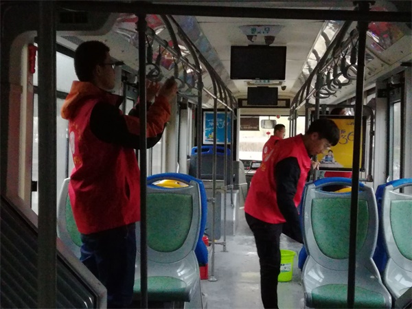 活动当天,在淅淅沥沥的小雨中志愿者们在部门部长的带领下来到了公交车站,与车站的工作人员进行了简单的沟通和交流。随后,在工作人员的指导下,志愿者们分工合作、互帮互助,他们左手抹布,右手水桶,干的热火朝天。对226公交总站服务基地及停放在场区内的所有公交车进行全面清扫,从地面到座位,从车窗到扶手,每一个角落大家都认真打扫,他们用自己的实际行动展现了当代大学生的青春风采。