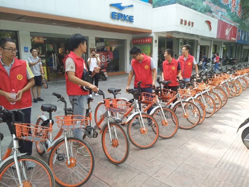 志愿者开始行动起来,将路边乱停乱放的共享单车系上黄丝带并摆放到规定的停车地点。最后,摆放整齐的共享单车成为合肥市路边一道亮丽的风景线。