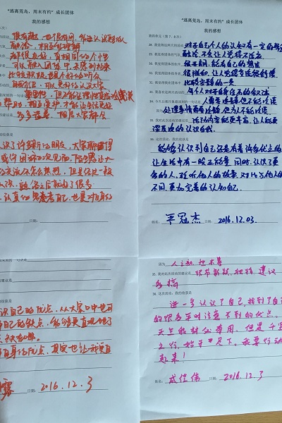 在活动之后,每一位参与的同学都会认真填写记录卡,写下自己的收获,同学们纷纷肯定了活动的意义以及活动对自己的帮助。13级学生徐嘉俊说:”刚开始的时候很紧张,但是之后随着心情的放松逐渐敞开心扉,越来越想表达自己。”13级学生成佳伟同学说到:“活动很有意义,让自己思考了很多,进一步认识了自己,找到了自己的很多平时注意不到的优点,但是千里之行始于足下,我要行动起来。”14级学生任新宇说:“通过这些活动,让我发现了自己身上的闪光点,也许不只游戏能给我们带来自信。”14级学生周鹏说到:“要多与身边的人交流,不能封闭自我的世界,朋友是人生中不可或缺的一部分。”