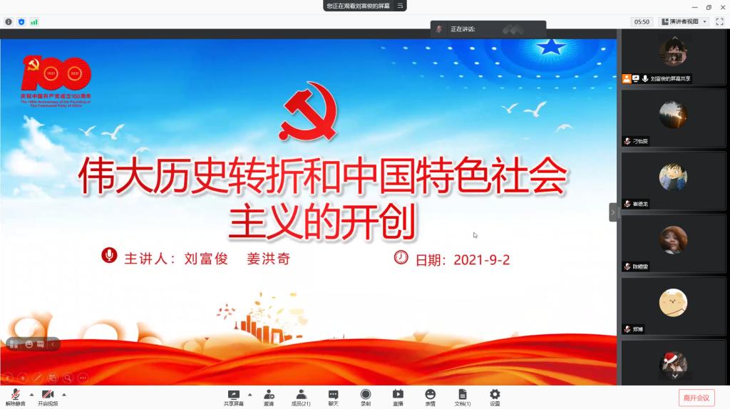 本科生第三党支部在腾讯会议集中开展“伟大历史转折和中国特色社会主义的开创”党史主题学习活动。主本次活动由刘富俊和姜洪奇两位同志主持并进行党史授课,第三支部全体成员(含预备党员)参加活动。