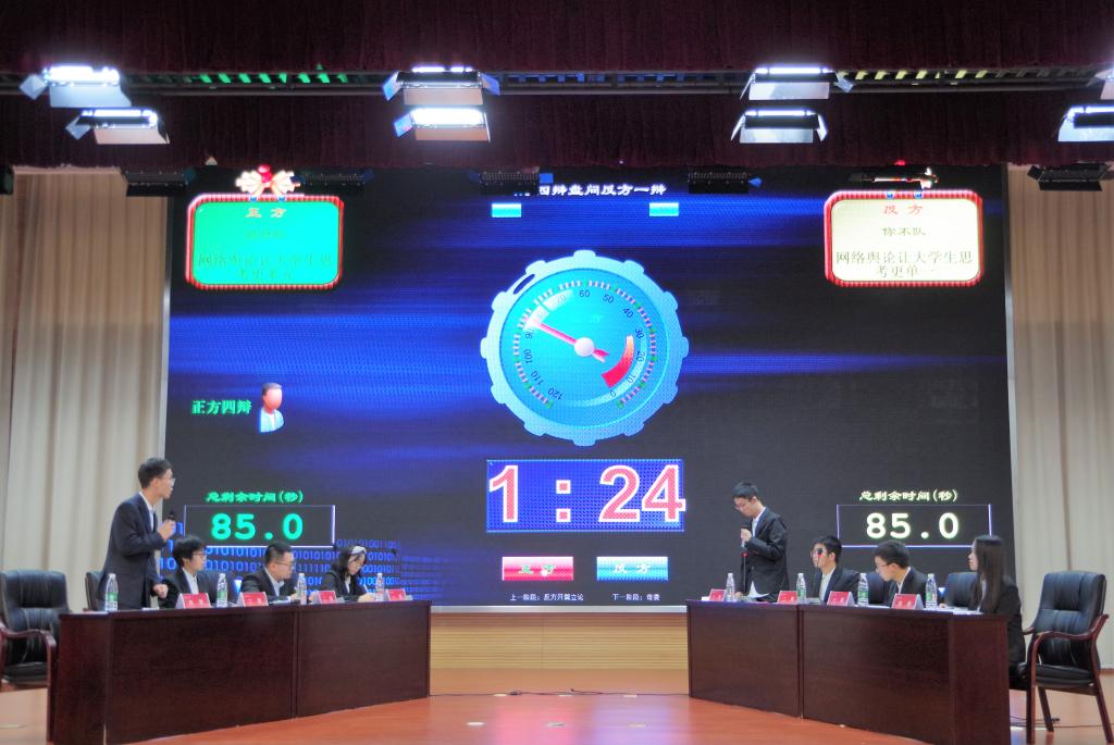决赛中,双方就“网络舆论对于大学生思考更多元还是更单一”这一辩题展开了激烈辩论,辩论中正方观点认为网络舆论让大学生思考更多元,有利于吸收别人的正确意见,开拓视野;反方则认为网络舆论让大学生思考更单一,学生更倾向于接触与原有态度较为一致的信息。双方辩手紧扣辩题,唇枪舌战,为台下的评委和观众带来了一场思维与语言的盛宴。