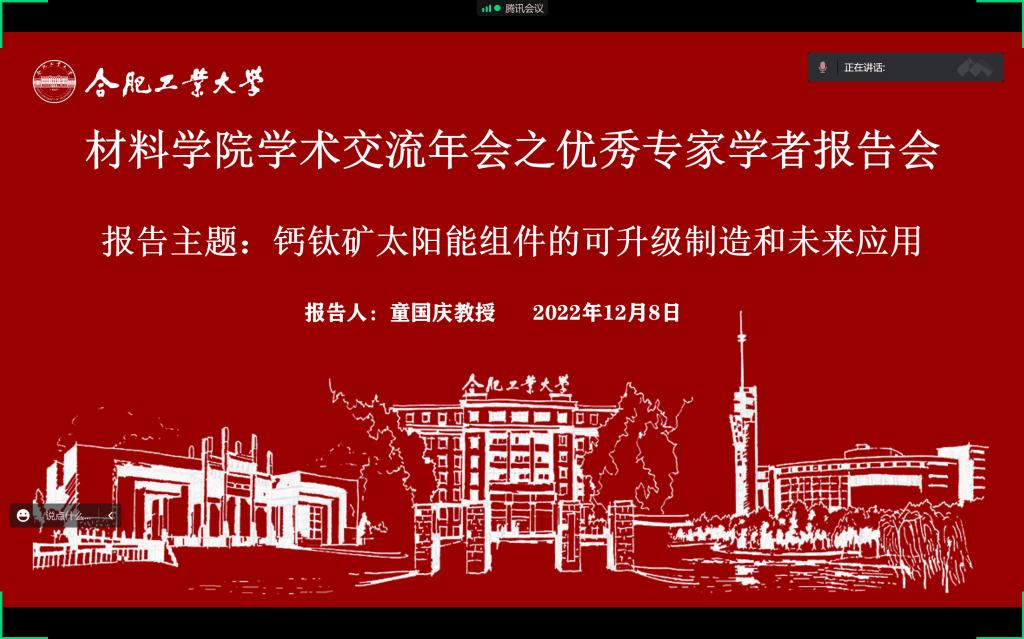 黄山学者优秀青年人才计划主持人童国庆教授于12月8日在材料楼6楼601会议室做关于钙钛矿太阳能组件的可升级制造和未来应用报告会。