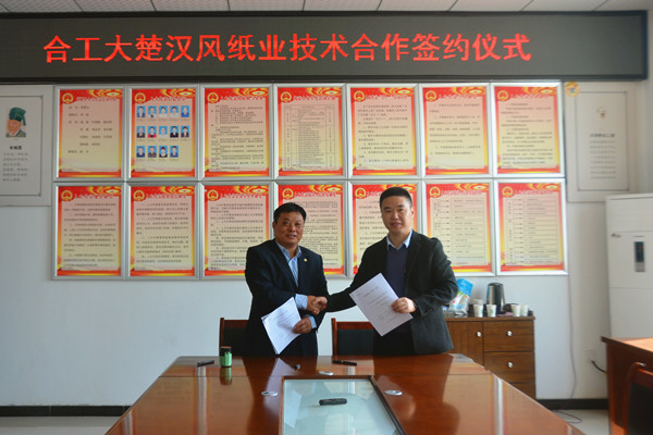 项宏发教授和楚汉风纸业有限公司法人张彬代表校企双方签署技术开发合作协议。