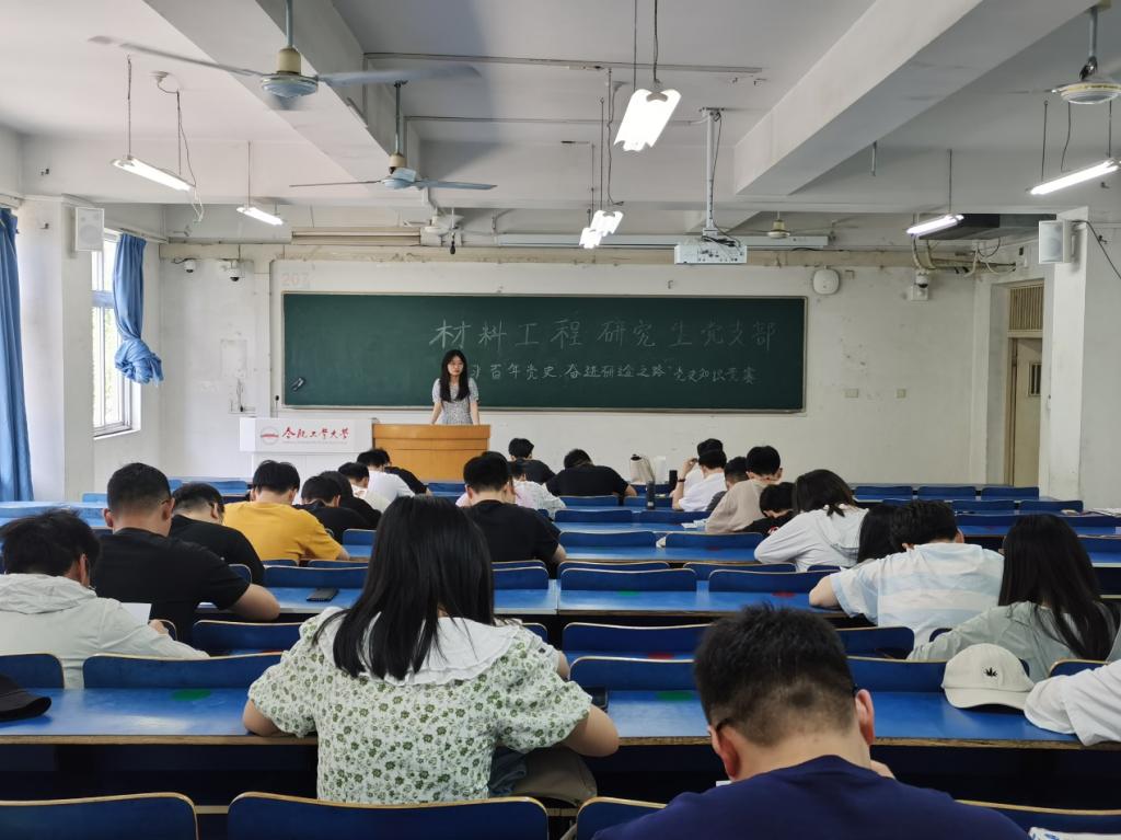 为推动党史学习教育常态化长效化,迎接党的二十大胜利召开,6月17号下午14:00,材料工程研究生党支部在屯溪路校区西二教学楼207举办“学习百年党史,奋进研途之路”主题党史知识竞赛活动。党支部全体党员参加线下知识答题。通过党史知识竞赛,进一步营造了良好的学习氛围,检验了党支部思想政治教育效果,提高了学生党员的政治理论素养及党性修养。